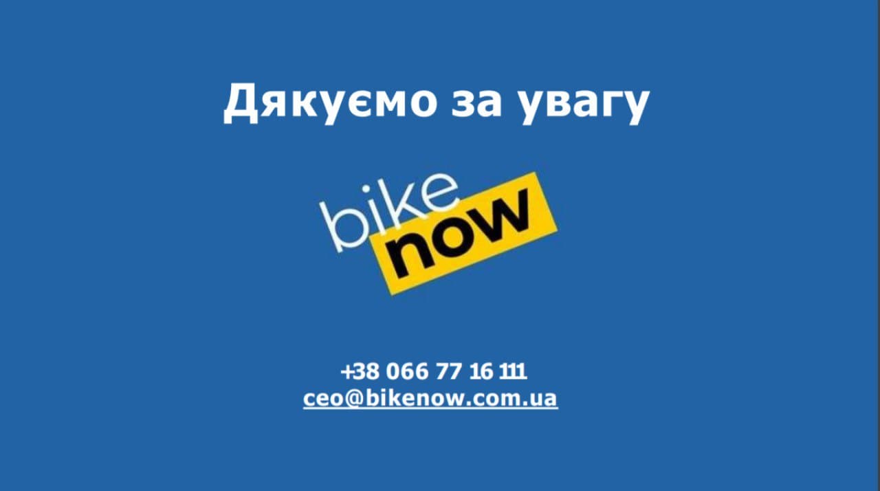 Інтеграція з додатками партнерів Розміщення реклами на траспорті Базова вартість одного велосипеда 500,00 грн./місяць + Розміщення Знижка при розміщені на 500+ велосипедах 20%Знижка при розміщені на 1000+ велосипедах 30% + Банер в додатку Реклама в FB Instagram Пропагування та підтримка здорового способу життяПросто, сучасно та іноваційноСтало та екологічноНезліченні ліди на вулицях 24/7Швидко та динамічно Поширюєть сучасними, мобільними та прогресивними людьми Звичайна реклама (рекламні площини, реклама в ефірі, контексна реклама)Х Засмічує інформаційний простірХ Нав’язливаХ Символізує втрату часу(перегляд реклами на ТБ, You Tube, споглядання реклами у корку або очікуючи громадський транспорт) Реклама на велосипедах Екологічна, зелена, сучасна та інноваційнаНенав’язливаДинамічна (символізує рух вперед, швидкість)Кросмедійна (також і у мобільному додатку)Маштабна (велосипеди переміщаються по всьому місту)